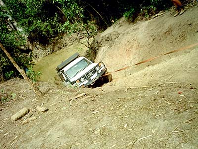 Doch auch mit dem Snatch Strap klappts nicht - das andere Fahrzeug wird beinahe in den Graben gezogen ...