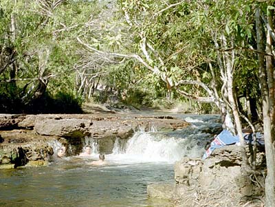 Eine Erfrischung im Dulhunty River. Die Furt verläuft direkt oberhalb dieser Stromschnellen.