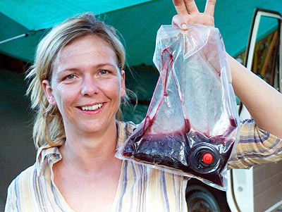 Was aussieht wie eine Blutkonserve ist Rotwein in Plastiktüten - absolut gut. Unser Favorit ist der Shiraz, der aber langsam zur Neige geht ...