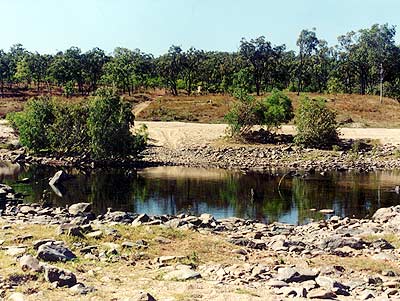 Endlich am Palmer River. Wie immer vor einer Flussüberquerung, durchwate ich das Wasser zuerst zu Fuss. In der Flussmitte mache ich aber schleunigst kehrt - liegt doch da tatsächlich eine Schlange im Wasser ...