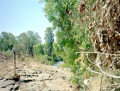 Die Ausfahrt aus dem Humbert River ist recht ruppig und führt über grobe Steine. Im Vordergrund ist auf kopfhöhe ausgetrocknetes Treibgut vom letzten Hochwasser zu sehen.
