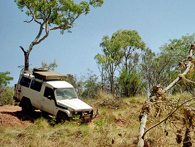 Bullita Stock Route - Runter an die zweite Ueberquerung des East Baines Rivers. Im Vordergrund ist in den Aesten angeschwemmtes Material aus der letzten Wet zu sehen. Diese Stelle liegt über zehn Meter oberhalb des nun ausgetrockneten Flussbettes.