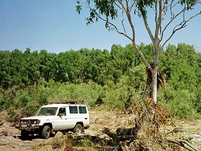 Bullita Stock Route - Die Ausfahrt nach der Ueberquerung des East Baines Rivers - über grobe Steinblöcke